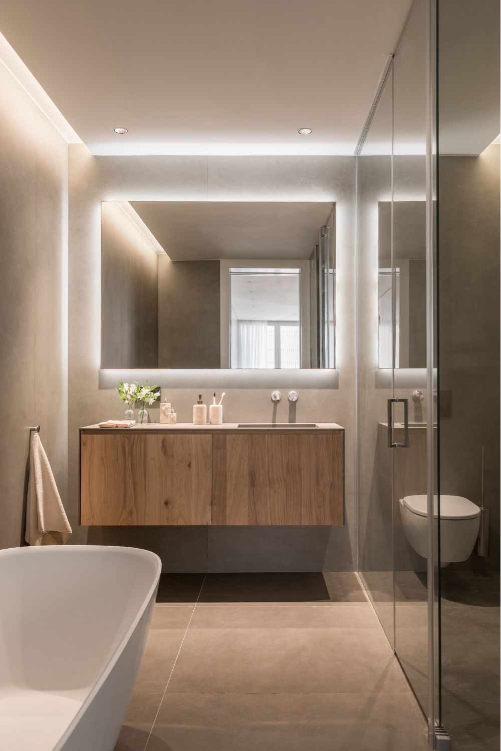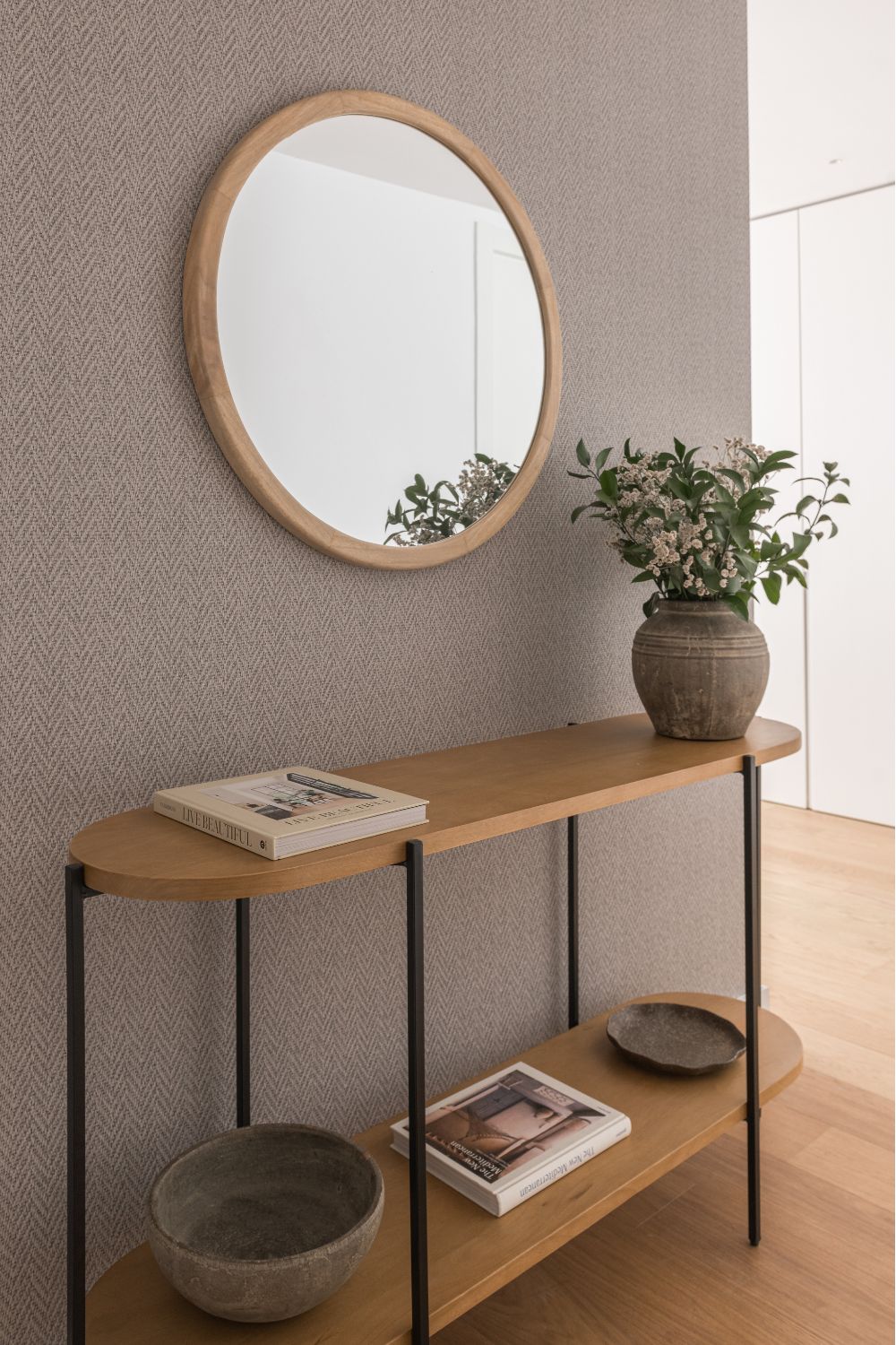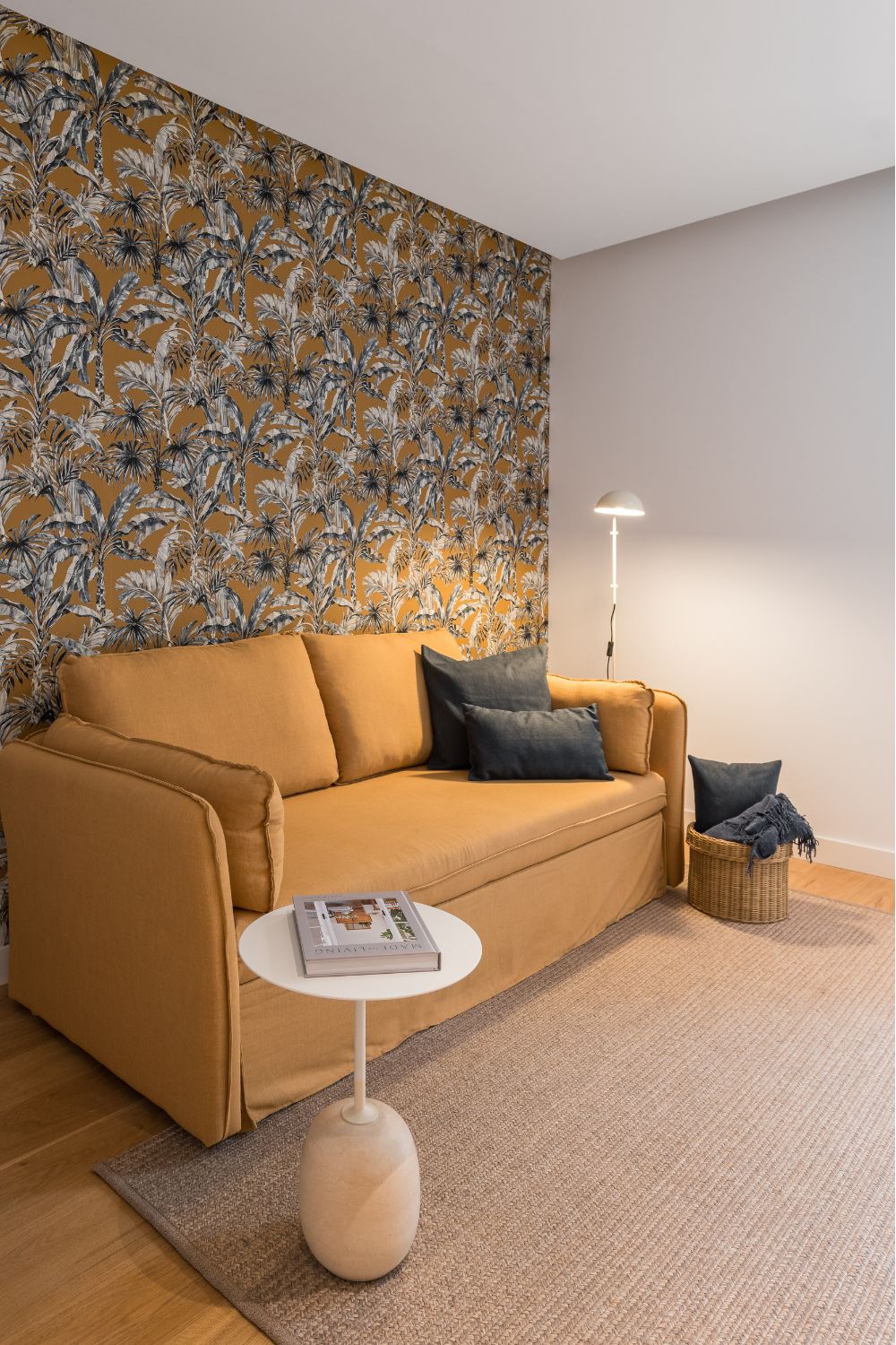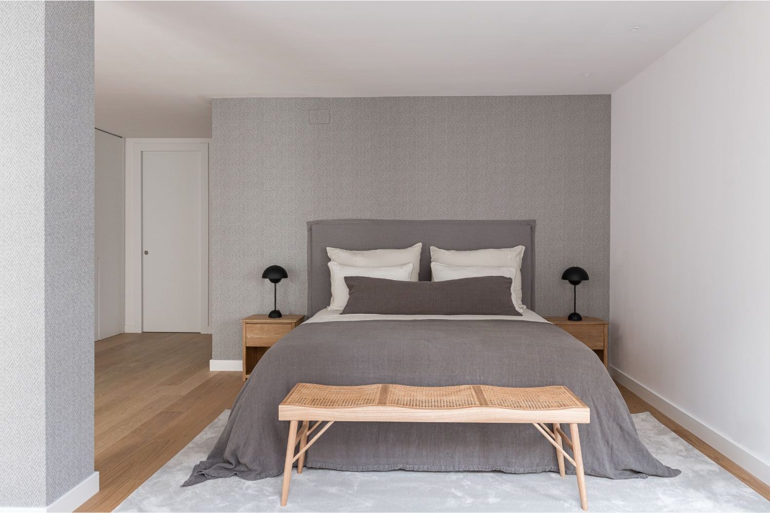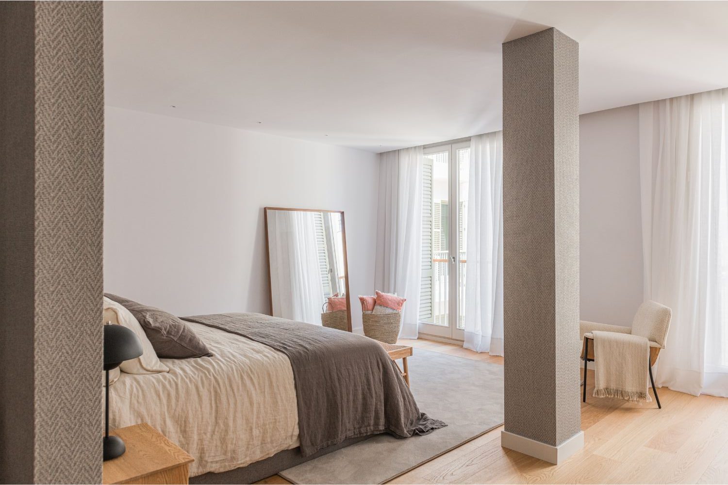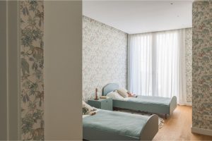 La vivienda cuenta con tres dormitorios. El principal, una amplia suite, incorpora un vestidor y un gran baño equipado con dos alcachofas de ducha y una bañera exenta que aporta un toque de sofisticación. El segundo dormitorio se planteó como habitación infantil, cálida y versátil. El tercero, configurado como sala de estar, incluye un sofá cama para acoger cómodamente a invitados, ampliando así las posibilidades de uso del espacio.