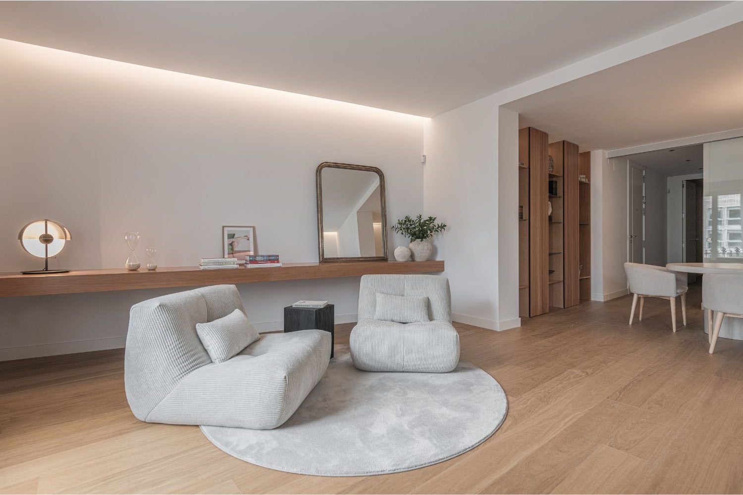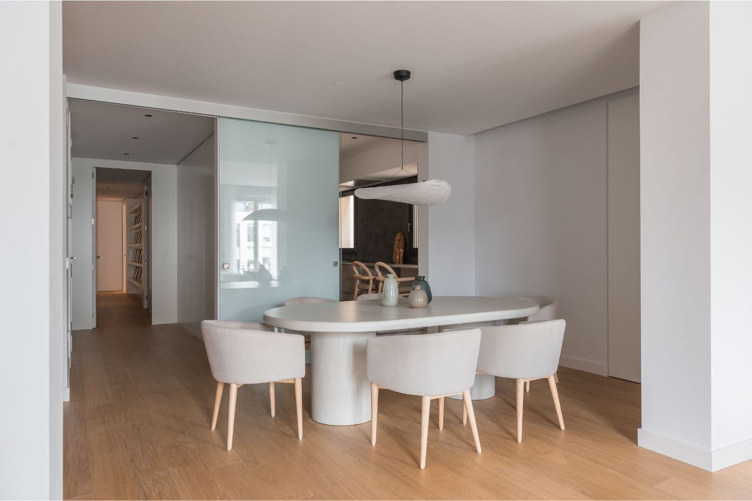 El salón comedor, abierto y bañado por la luz natural que entra desde Paseo de Gracia, se concibió como el corazón social de la vivienda. Integramos un mueble a medida en la zona de comedor que aporta funcionalidad y carácter sin perder la neutralidad buscada. La cocina, práctica y cómoda, queda visualmente conectada pero independiente gracias a una cristalera que permite mantener la luminosidad y la amplitud del conjunto.
